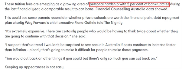 学费正成为一个日益严重的个人经济困难领域。Financial Counselling Australia的数据显示,上个财年有2%的破产与教育费用相关,与车贷破产比例相当。