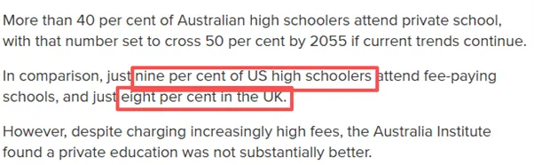 超过40%的澳大利亚高中生上私立学校,如果当前趋势持续,到2055年这一比例将超过50%。相比之下,美国只有9%的高中生上收费学校,英国只有8%。