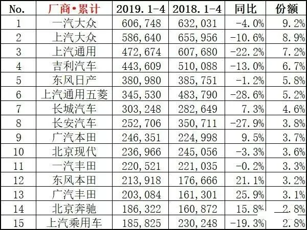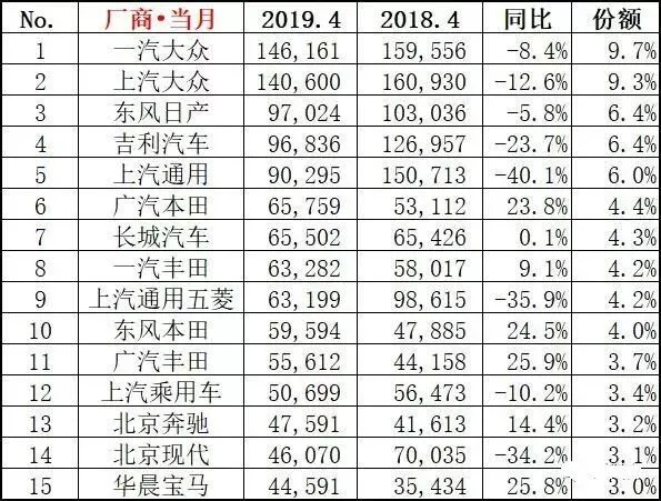 前四月销量统计排名中,一汽大众、上汽大众和上汽通用的地位没有变化,但上汽通用22%的跌幅十分危险。