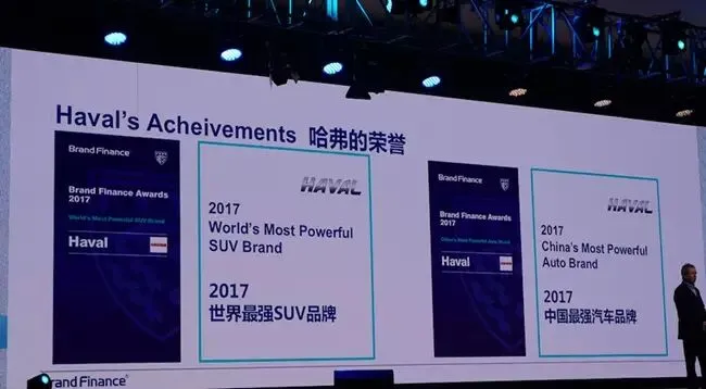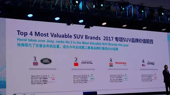 ●“2017专项SUV品牌价值”排名,哈弗成功超越JEEP品牌,成为全球第二最具品牌价值的SUV品牌。