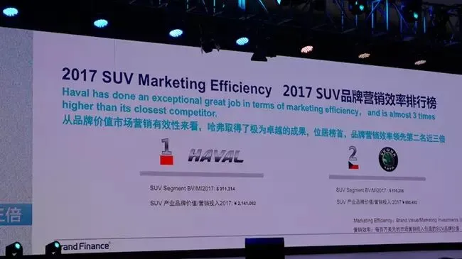 ●2016年,哈弗的品牌价值为30亿美元,品牌价值增长高达40%。在市场营销有效性方面,以领先第二名近三倍的品牌营销效率,位居榜首;