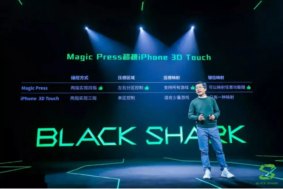 黑鲨自主研发的Magic Press技术,在屏幕左右半屏各设置一个压力传感器,可分别进行独立的游戏功能键映射,实现手机三位触控功能,再复杂的游戏操作,只需两指便可一气呵成。在吃鸡类游戏中,普通玩家也可打出“拜佛枪”“跑枪”“蹲闪”等专业级技术动作。