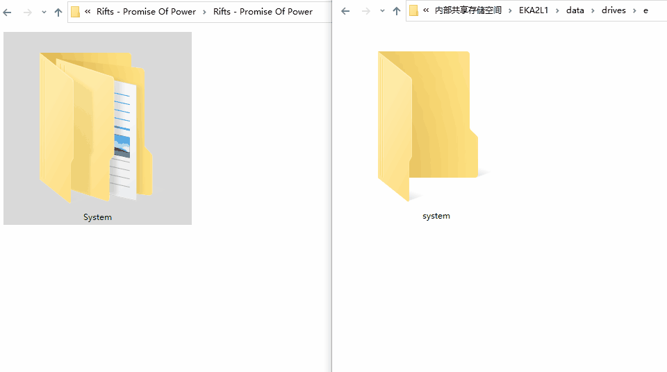 我们把它拖到手机目录的【 内部共享存储空间>EKA2L1>data>drives>e 】,让 2 个 System 文件合并,注意点上“ 为所有当前项目执行此操作 ”。