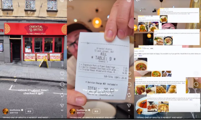INS@bosfinesse海外社交平台网友分享的中餐体验及平均消费