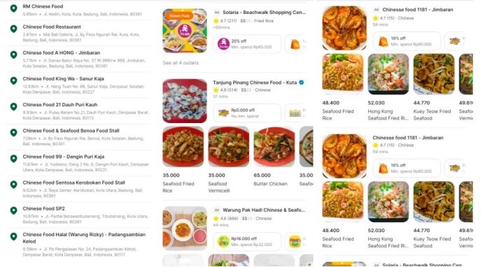 Grab Food订餐软件,左图以市中心为商圈的中餐馆,基本2公里范围一家,其余是中餐的品种与价格。