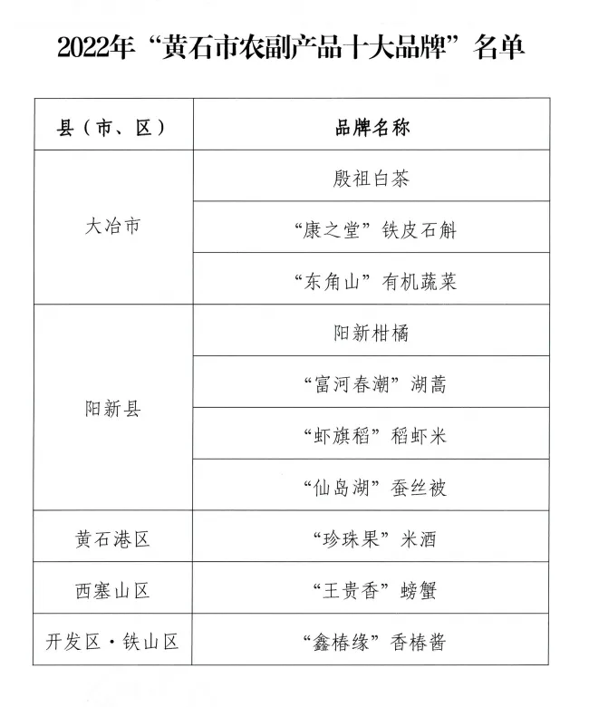 经过主体申报、县 (市、区)农业农村部门初审推荐、网络投票、专家综合评审、公示、市农业农村局局长办公会研究等程序,最终,殷祖白茶、“康之堂”铁皮石斛、“东角山”有机蔬菜,阳新柑橘、“富河春潮”湖蒿、“虾旗稻”稻虾米、“仙岛湖”蚕丝被、“珍珠果”米酒、“王贵香”螃蟹、“鑫椿缘”香椿酱,获评2022年黄石市农副产品十大品牌。