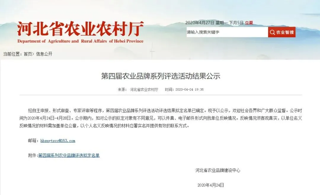 近日,从河北省农业农村厅网站获悉,经自主申报、形式审查、专家评审等程序,河北省第四届农业品牌系列评选活动评选结果拟定名单已确定。现予以公示↓↓↓