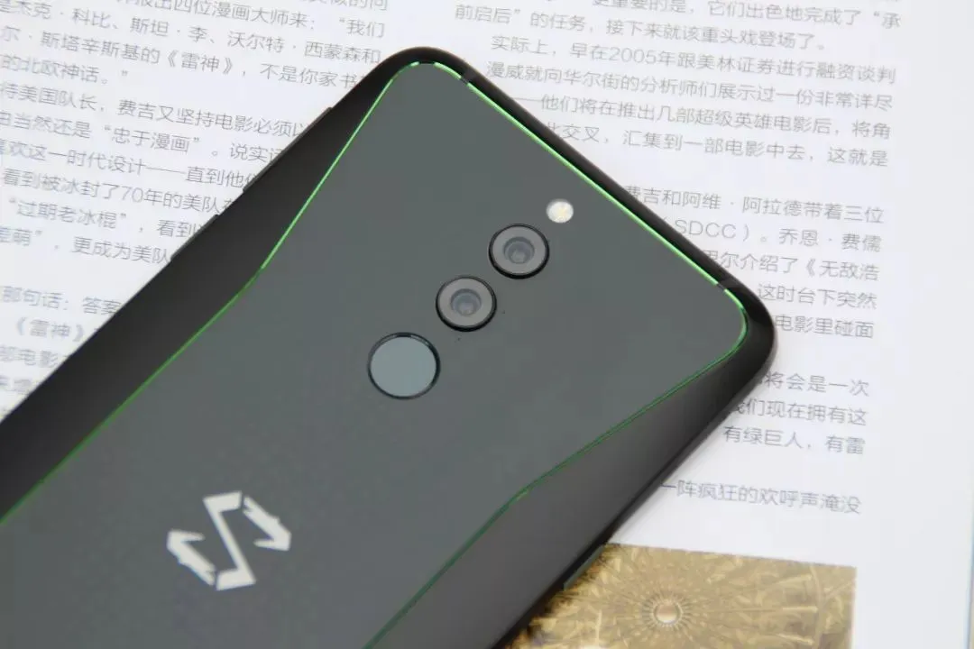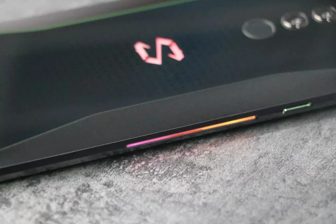 黑鲨一代背面标志性的三角形纹理被藏在了玻璃盖板下,极果君个人觉得这样的设计比一代在品质感上有了很大的提升。双摄变成了纵向,与指纹模组连成一串,这次背面的黑鲨LOGO直接采用了更简洁的镂空设计,当然,信仰灯也变得更亮……也更骚了……