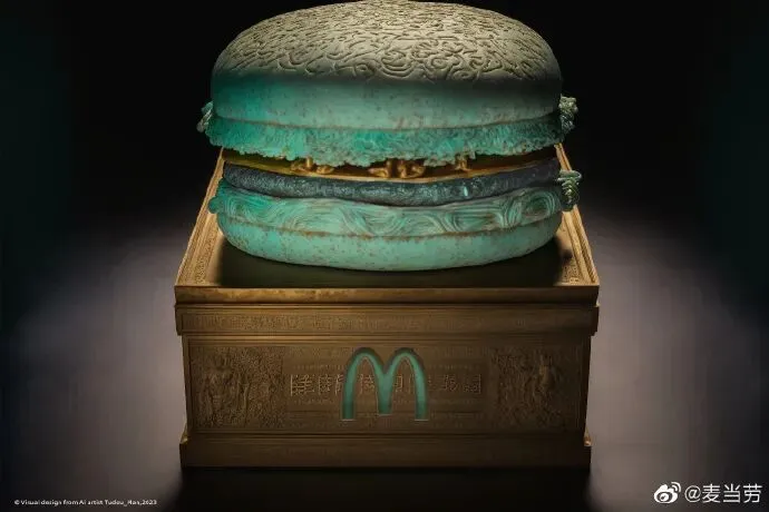比如兵马俑、敦煌壁画,或是更遥远的青铜器......如果它们“生活在现代”,你又会做怎样的反应?比如三星堆彩妆、以及...麦当劳最近展出的这“尊”粉丝创作的青铜器汉堡: