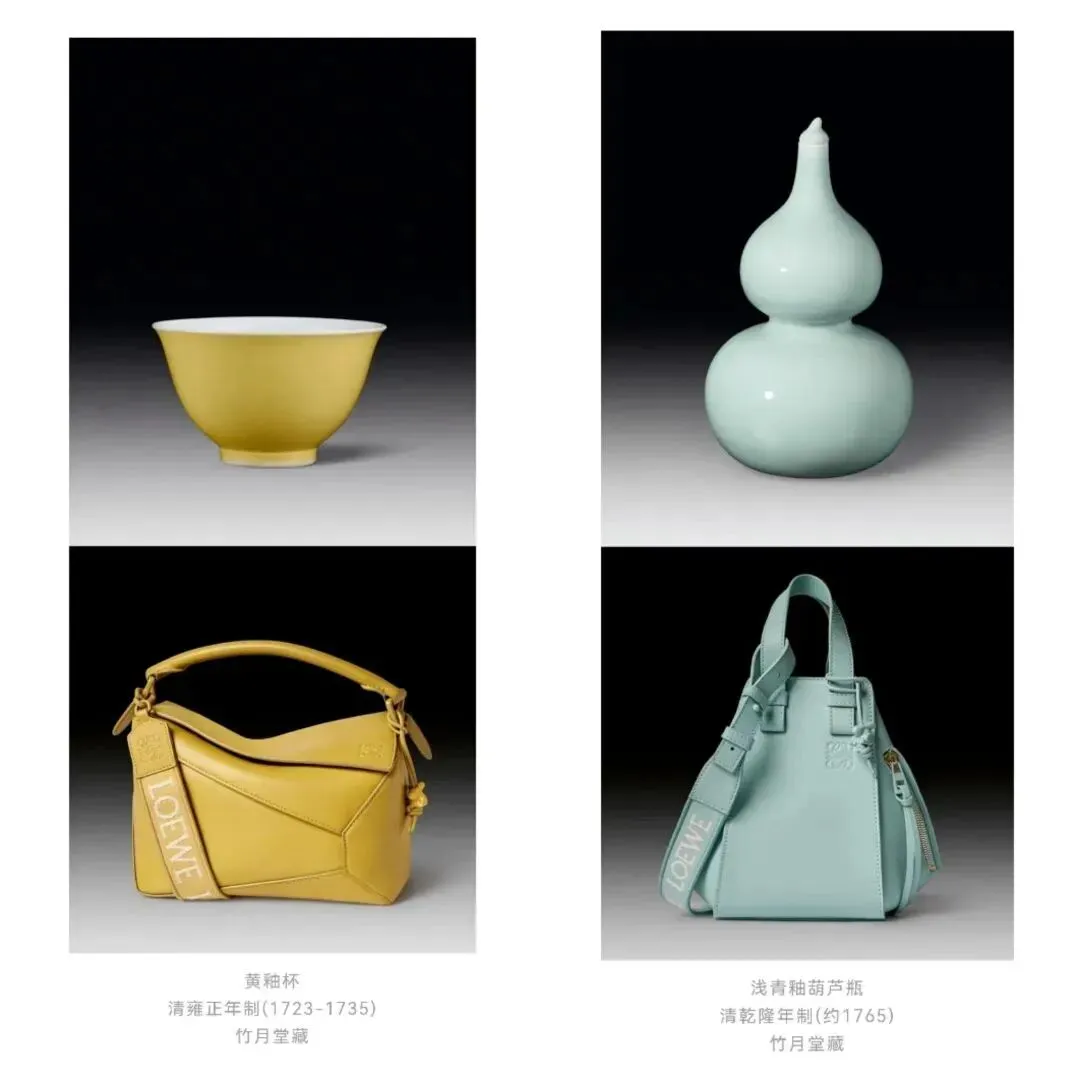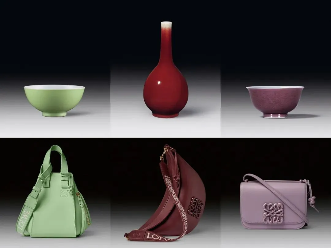 LOEWE在去年11月推出的2023早春系列手袋,是以中国明清时期的单色釉为主题。LOEWE也没有对色彩进行简单的复刻,而是在了解中国文化的基础上,挖掘到比较小众的明清两代陶瓷艺术里的极简美学。