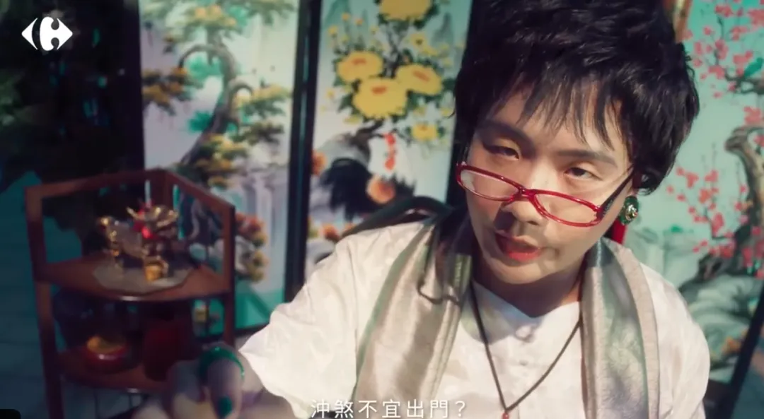 短片的三个片段对应三个宇宙,「阮氏宇宙」里通过婆媳之间的感情体现家乐福零食的多样性;「羞羞草宇宙」里用少女挑选”青春贡品”展现家乐福的“严选品质”;最后「丽芳宇宙」与前两个宇宙相连通,以“展现家乐福冲煞不宜出门“的节日痛点切入,表现家乐福配送到家的服务保障。