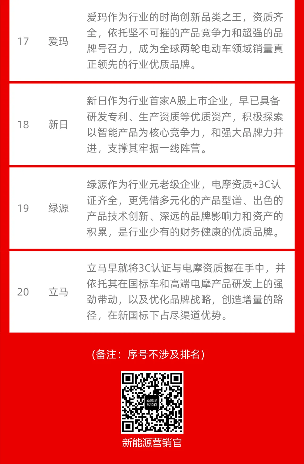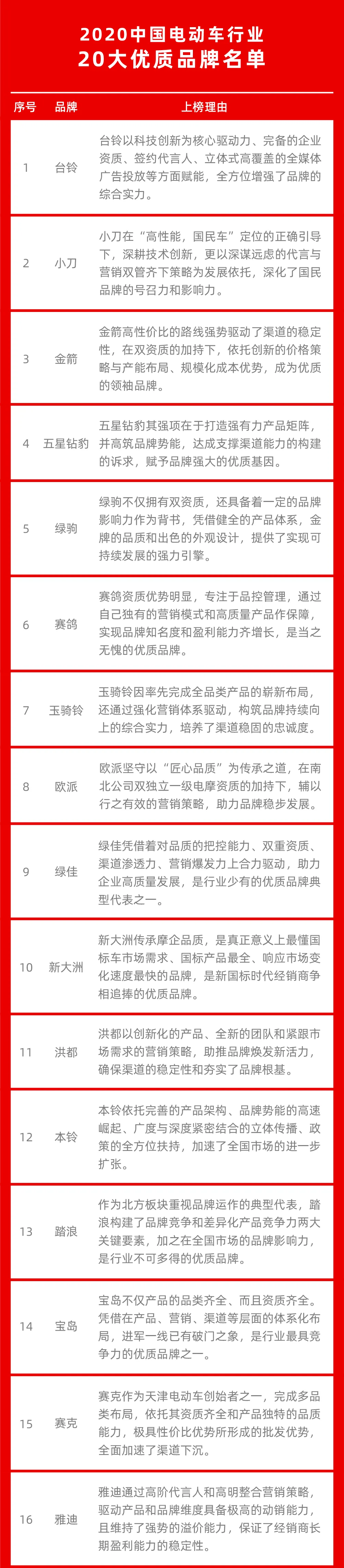 新国标一周年,是整个行业经历升级转型后全新的开始,国标车和电摩兼优、资质齐全的品牌成为经销商首选。结合各大品牌的资质情况和品牌声量、企业健康度,以及品牌影响力,甄选出如下获得急速成长的20大优质品牌。