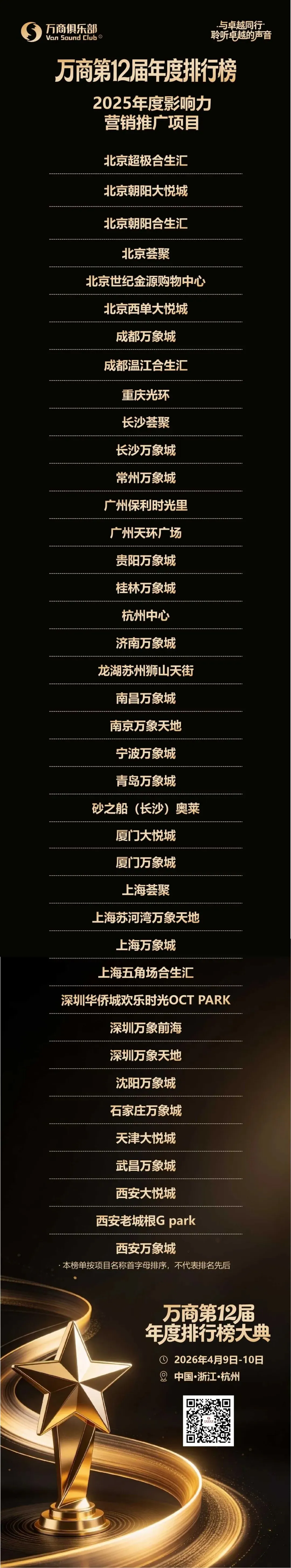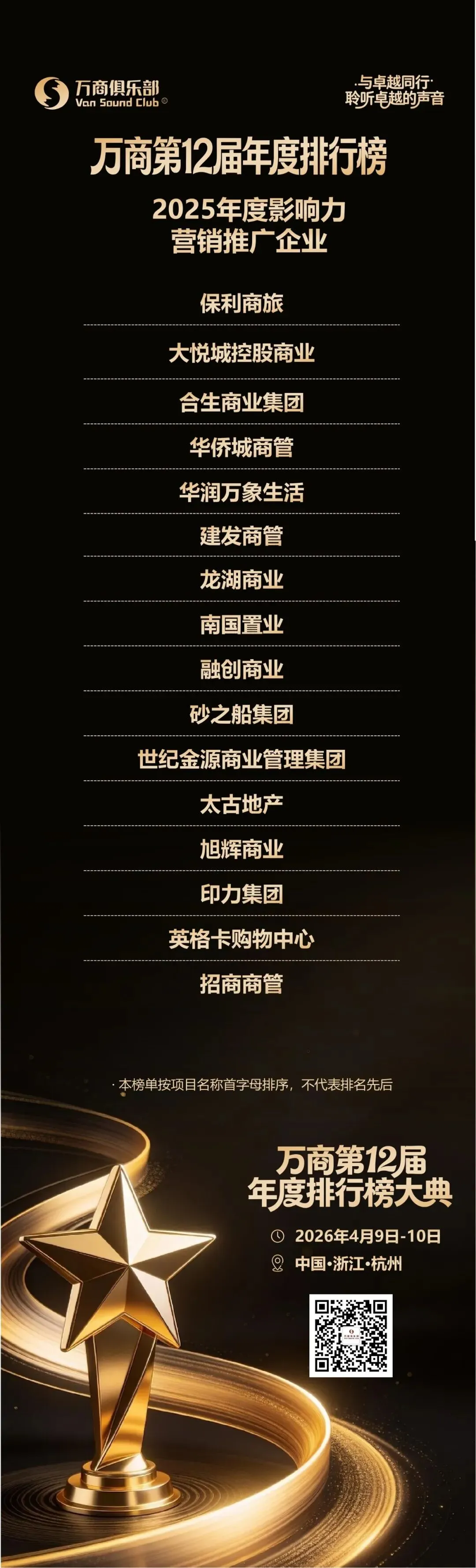 2026年4月9日-11日(4.9将组织卓越项目参访,4.10白天为年度排行榜卓越分享,晚上为排行榜年度大典颁奖晚宴,4.11上午为年度30人闭门峰会),我们将继续“与卓越同行”,在杭州,组织“万商年度排行榜大典”,我们的Slogan依旧是“与卓越同行,一起聆听卓越的声音”,欢迎并期待获奖的卓越企业代表参加或分享!