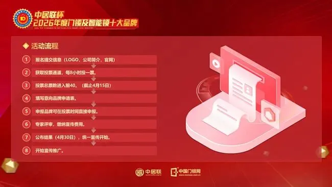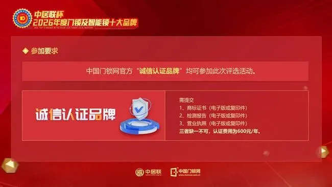 目前,“中居联杯·2026门锁及智能锁十大品牌”网络评选活动报名通道已正式开放。诚邀全国门锁及智能锁相关企业积极参与,共同展示品牌实力,角逐行业年度荣誉。