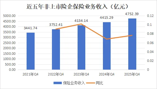 保险业务收入近五年逐年增长,逐步从2021年Q4的3441.74亿元增至2025年Q4的4752.39亿元,四年累计增长38.08%。究其原因,除了市场主体数量有所增加外,主要原因包括:市场需求结构性扩张(尤其在健康、养老等领域)、监管政策引导行业回归保障本源并鼓励产品创新,以及险企通过数字化渠道优化与服务效率提升共同驱动业务规模健康增长。