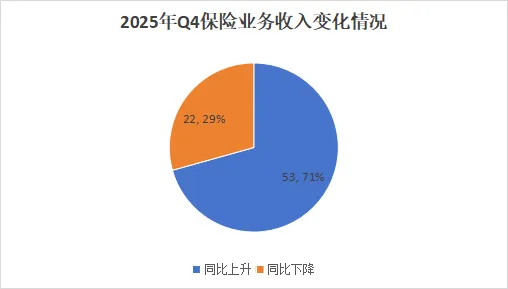 上图可见,与2024年数据相比2025年Q4保险业务收入正增长的险企降至53家,占公布数据公司总量的71%,2024年同期为58家;同比下降的为22家,2024年同期为16家,数量增加6家。