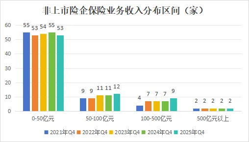2025年Q4非上市财险行业整体保持增长态势,但表面平静之下暗流涌动,危机四伏。在披露数据的76家险企中,近七成公司保险业务收入实现正增长,行业总规模同比增长7.63%,达4752.39亿元。自2021年以来,行业保费五年累计增长38.08%。马太效应加剧,市场份额进一步向头部集中。非上市险企保费占行业总份额约27%,较2024年同期下降。非上市财产险企保险业务收入规模占比TOP10中,申能财险的规模上升2.69%占比最多;而国寿财险的规模占比下降最多,为1.44%,丢失了部分市场份额。值得关注的是,2025年险企保费变阵,大家财险、申能财险、安诚财险、阳光农险等4险企升格进入保费数据更高梯队。持续稳定的「50-100」亿元、「100-500」亿元梯队均实现增员。具体来看,行业排名波动明显,强者恒强格局延续。在有同比数据的75家险企中,41家排名下滑,20家上升。其中,申能财险、大家财险保费突破百亿元;而在增速排行中,申能、比亚迪、众惠跻身前三。观潮小注:全文所述Q4保险业务收入,系累计数据口径,为未经审计的全年保险业务收入数据。01