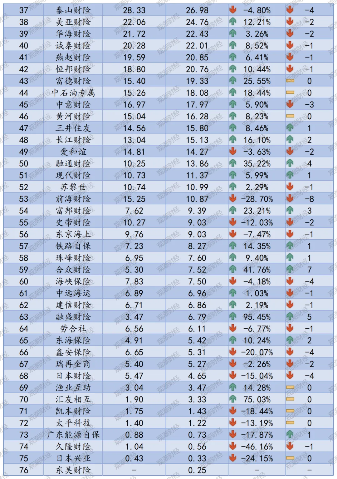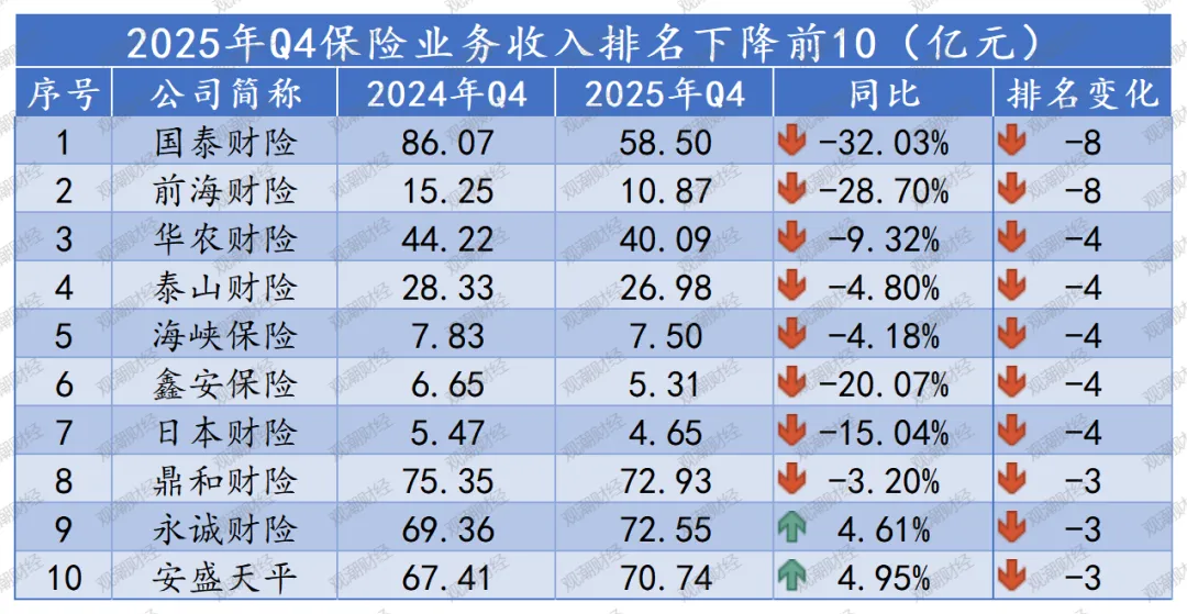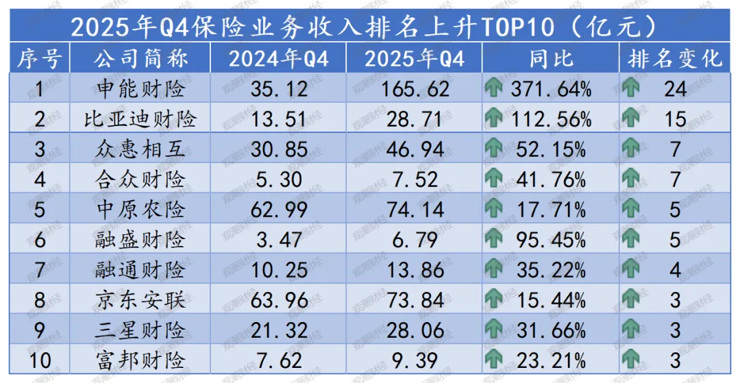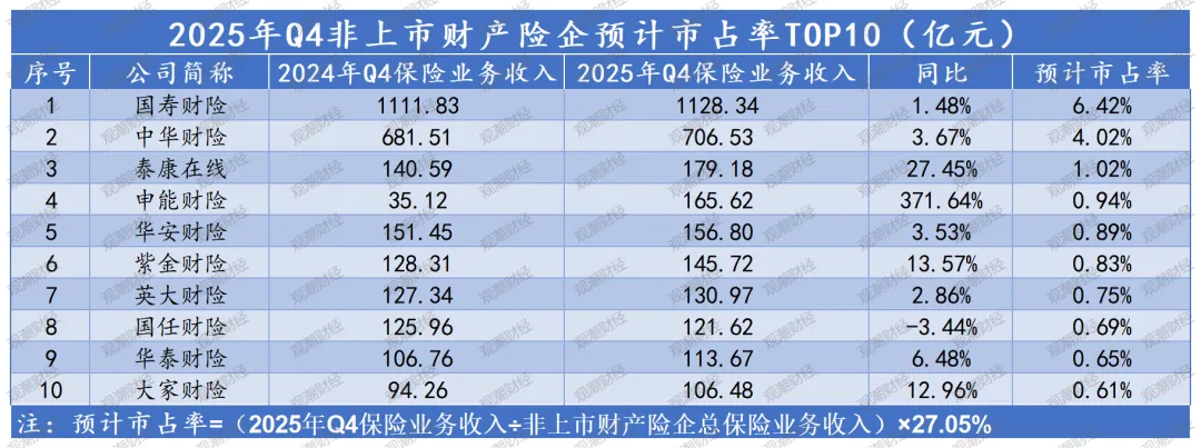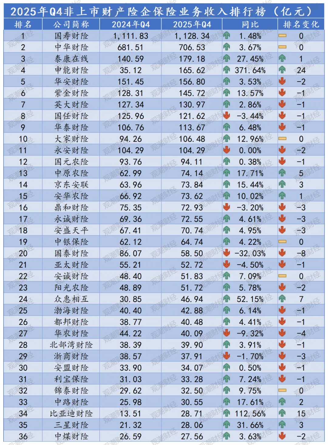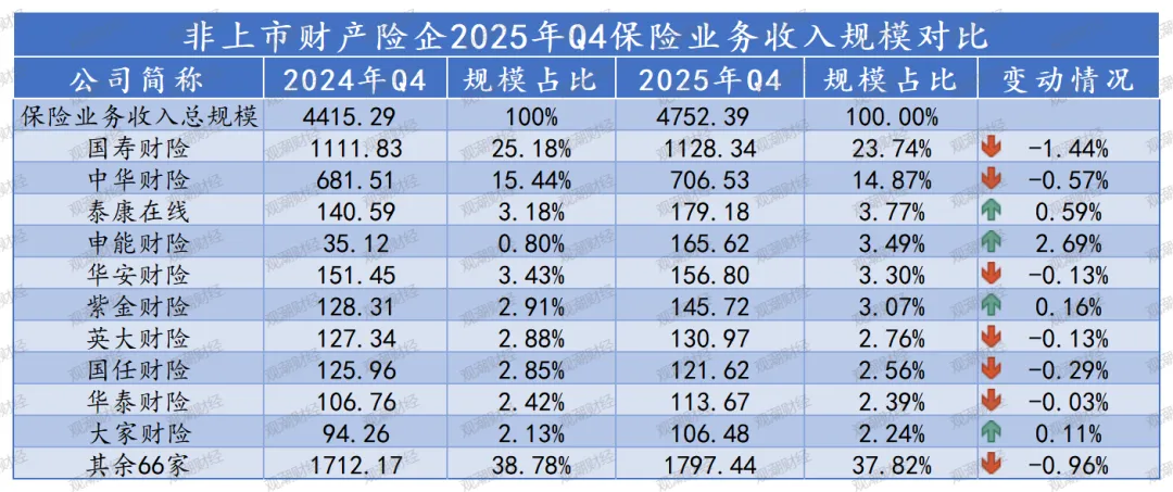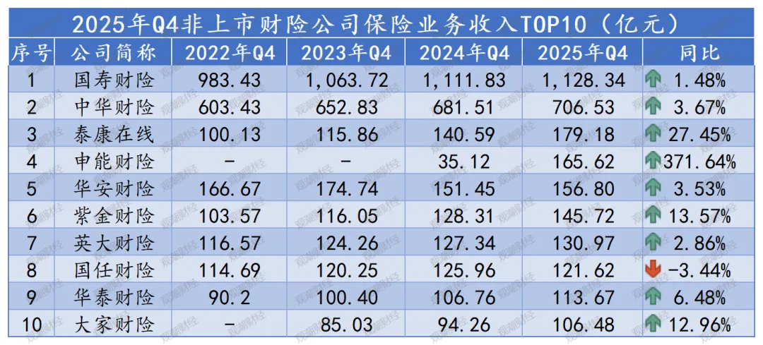 据观潮财经梳理,2025年Q4有同比数据的75家险企中,41家险企排名下滑,20家险企排名上升,14家险企排名无变化。市场格局延续“强者恒强”特征,部分中小型险企依托股东资源或差异化战略实现跨越式增长,其中申能财险表现尤为亮眼,保费收入从2024年的35.12亿元猛增至165.62亿元,排名上升24位,成为行业最大“黑马”。值得一提的是,申能财险前身天安财险本身保费体量较大,转身申能财险之后首年只公布了转身后起算保费数据,并非全年数据,2025则是全年保费,故数据对比增速明显。据统计,非上市财产险企保险业务收入TOP10中,国寿财险稳居榜首,近3年Q4保险业务收入均超千亿,且逐年上升。2025年Q4实现收入1128.34亿元,较2024年Q4同比上升1.48%。此外,中华财险稳居第二,近4年逐年上升,由2022年Q4的603.43亿元上升至2025年Q4的706.53亿元,较2024年同期同比上升3.67%。值得注意的是,申能财险、大家财险2025年Q4首次突破百亿,分别达165.62亿元、106.48亿元,分别较2024年同期同比上升371.64%、12.96%。此外,国任财险虽保持在非上市险企TOP10序列中,但保费规模有所下降,2025年Q4下降3.44%至121.62亿元。从保险业务收入行业排名变化情况来看,2025年Q4有同比数据的75家财险公司中,有20家险企排名上升,41家险企排名有所下滑,有14家险企排名稳定无变动。值得关注的是,除了比亚迪财险在发展初期排名上升比较快之外,申能财险亦实现双位数上升,较2024年同期排名上升达24名次,变身黑马。此外众惠相互、合众财险2家险企排名上升超5名,2025年Q4保险业务收入分别达46.94亿元、7.52亿元。中原农险、融盛、融通、京东安联、三星、富邦等6险企亦排名上升,分别上升5位、5位、4位、3位、3位、3位。值得一提的是,10家险企虽全部实现同比正增长,但增长率跨度较大,从15.44%至371.64%不等,显示出差异化的增长动能。排名下降TOP10丨8家负增长,永诚、安盛天平保费上升从排名下滑的41家险企来看,国泰、前海财险下滑最多,均下降了8名。其中,国泰财险保费缩水近三分之一,降额近30亿元。此外,华农财险、泰山财险、海峡保险、鑫安保险、日本财险5家险企均下滑4位。值得一提的是,永诚财险、安盛天平排名虽均下滑3名,但2家公司保险业务收入有所上升,分别同比上升4.61%、4.95%至72.55亿元、70.74亿元。根据统计,76家非上市财产保险公司2025年保费收入合计4752.39亿元,金融监管总局披露的数据显示,2025年财险公司整体原保费收入达17570亿元,非上市险企的保费份额约为27%,刚过四分之一。而2024年同期,非上市险企的保费份额约为29.7%。由此可见,财产保险市场的马太效应进一步加剧。具体至76家非上市财产险企规模占比来看,仅国寿财险一家就占据非上市险企规模的23.74%,再加上第二梯队中华财险的14.87%规模占比,两家规模合计占非上市险企近四成。不过,2家险企规模均有所下降。其余74家险企单家规模均未超4%。非上市财产险企保险业务收入规模占比TOP10中,除国寿财险、中华财险外,华安、英大、国任、华泰4家险企规模占比也下降,其余4家均上升。TOP10中,申能财险的规模占比上升最多,为2.69%,国寿财险的规模占比下降最多,为1.44%。其余66家中小险企整体占比下降0.96%,体现中小险企规模增速较小,承压更大,略显行业分化之势。截至发稿,上市财产公司尚未披露其2025年Q4的原保险业务收入。若以2025年Q4非上市财产险企所占的总体行业份额27.05%来计算,非上市险企的市占率前10数据如下表所示。(预计市占率仅供参考,不代表2025年Q4实际市占率)整体增长之下,市场份额向头部集中的趋势已愈发清晰。申能财险等转身后的险企异军突起展示了资源与战略的爆发力,但更多中小公司正面临增长压力。未来的竞争,是综合实力与差异化生存能力的双重考验。附:2025年Q4非上市财产险企保险业务收入排行榜