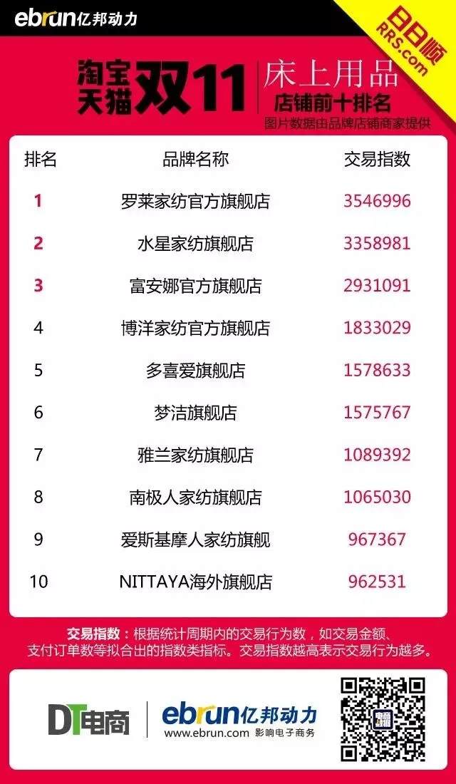 1、罗莱家纺官方旗舰店;2、水星家纺旗舰店;3、富安娜官方旗舰店;4、博洋家纺官方旗舰店;5、多喜爱旗舰店;6、梦洁旗舰店;7、雅兰家纺旗舰店;8、南极人家纺旗舰店;9、爱斯基摩人家纺旗舰;10、NITTAYA海外旗舰店
