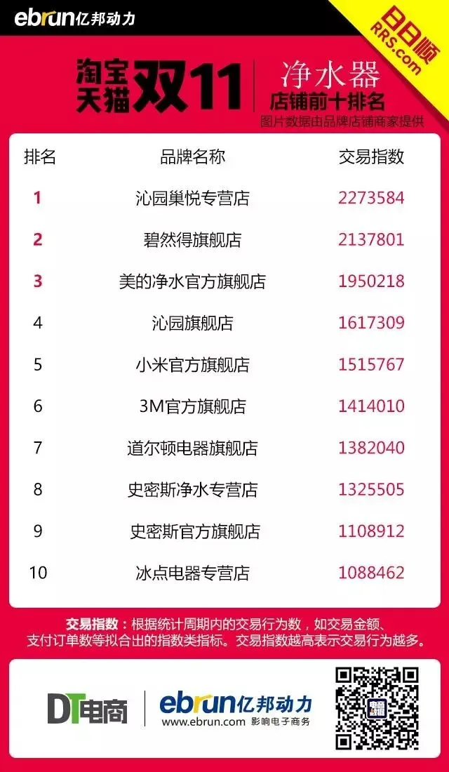 1、沁园巢悦专营店;2、碧然得旗舰店;3、美的净水官方旗舰店;4、沁园旗舰店;5、小米官方旗舰店;6、3M官方旗舰店;7、道尔顿电器旗舰店;8、史密斯净水专营店;9、史密斯官方旗舰店;10、冰点电器专营店