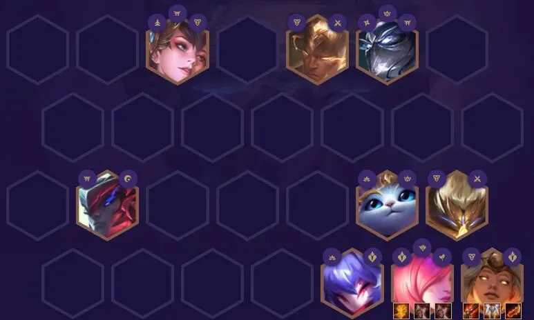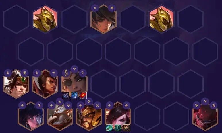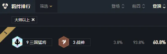 皮城执法官-蔚、德玛西亚之力-盖伦、德玛西亚皇子-嘉文四世、沙漠玫瑰-莎弥拉、狂野女猎手-奈德丽、沙漠皇帝-阿兹尔、蛮族之王-泰达米尔、不祥之刃-卡特琳娜、血港鬼影-派克9三国猛将(需三国天选和三国转职):所有三国猛将英雄获得850点生命值和85%法术强度,获得一次胜利会让这个效果增加10%,最高5层3战神:战神会在低生命值时获得15%~30%的生命偷取和额外伤害2神盾使:在战斗开始时,神盾使及神盾使周围的友军会获得150生命值的护盾,持续8秒,护盾作用在神盾使身上时会增加额外的50%护盾值2刺客:刺客会在战斗开始时跳至敌方后排,并获得10%额外的暴击几率和25%的暴击伤害2神射手:神射手的技能和普攻会弹射2名额外的敌人并造成降低65%的伤害。1主宰:主宰在每次攻击时会获得评级提升,并获得10%最大生命值的护盾,在评级满了后主宰会冲向敌人并释放技能。1枭雄:枭雄在场时会召唤2个沙兵,这两个沙兵可以移动部署,但在战斗开始后不能移动不能攻击,枭雄阵亡时沙兵也会同时阵亡沙漠玫瑰-莎弥拉:最后的轻语(反曲弓+拳套)、巨人杀手(反曲弓+暴风大剑)、三国转职(金铲铲+巨人腰带)不祥之刃-卡特琳娜:海克斯科技枪(暴风大剑+无用大棒)、水银(拳套+负极斗篷)、泰坦的坚决(反曲弓+锁子甲)