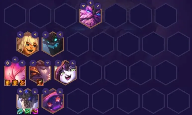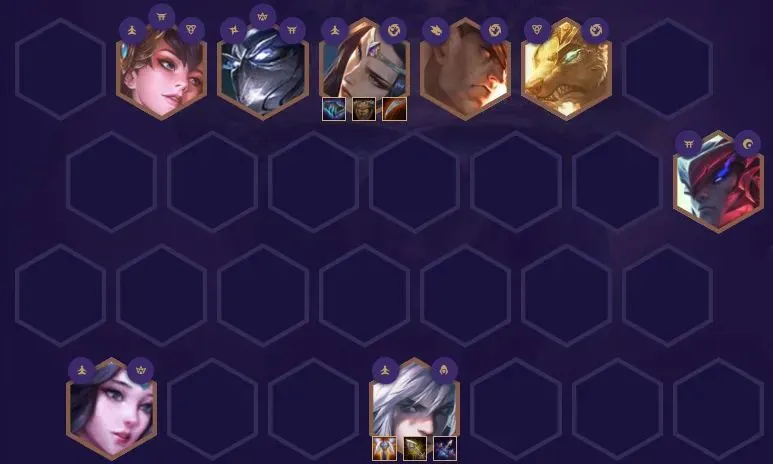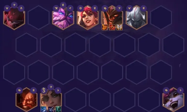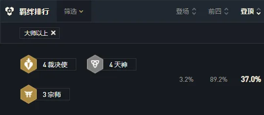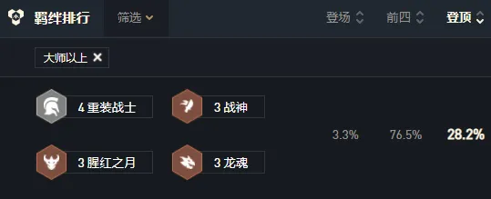血港鬼影-派克、山隐之焰-奥恩、北地之怒-瑟庄妮、狂战士-奥拉夫、暗裔剑魔-亚托克斯、弗雷尔卓德之心-布隆、沙漠玫瑰-莎弥拉、麦林炮手-崔丝塔娜3战神:战神在低血量时会获得15~30%的额外生命偷取能力和20~45%的额外伤害3龙魂:第一个受到伤害的英雄会获得龙魂祝福,获得40%的法术加成和攻击速度,并且每第五次普攻会释放龙焰吐息,造成目标50%最大生命值的魔法伤害。龙魂祝福的英雄阵亡后,祝福效果会传给最近的龙魂英雄,并且下次攻击会立即释放龙焰吐息。2神射手:神射手的技能和普攻会弹射2名额外的敌人并造成降低65%的伤害。1主宰:主宰在每次攻击时会获得评级提升,并获得10%最大生命值的护盾,在评级满了后主宰会冲向敌人并释放技能。1铁匠:在参与战斗后,【铁匠】将开始打造一件【神器】装备。【铁匠】的星级越高,打造速度就越快。一旦【神器】完成,他将会掉落在棋盘上。每名友方英雄只能装备一件【神器】。打造速度:1星4回合,2星3回合,3星1回合。狂战士-奥拉夫:死亡之刃(暴风大剑+暴风大剑)、卢安娜的飓风(反曲弓+负极斗篷)、守护天使(暴风大剑+锁子甲)
