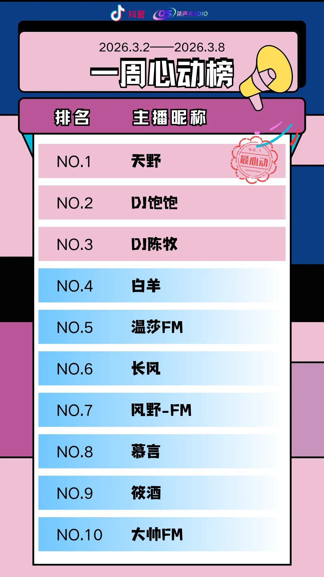 一周心动榜 | 柒声心动主播排行榜(3.2-3.8)
