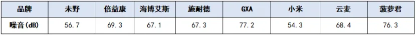 总结评价:通过测试发现未野、小米、云麦运行时发出的噪音都在60分贝以下,几乎没有存在感,适合的场景更多,其余产品的噪音甚至超过了70分贝,对使用体验有一定的影响。