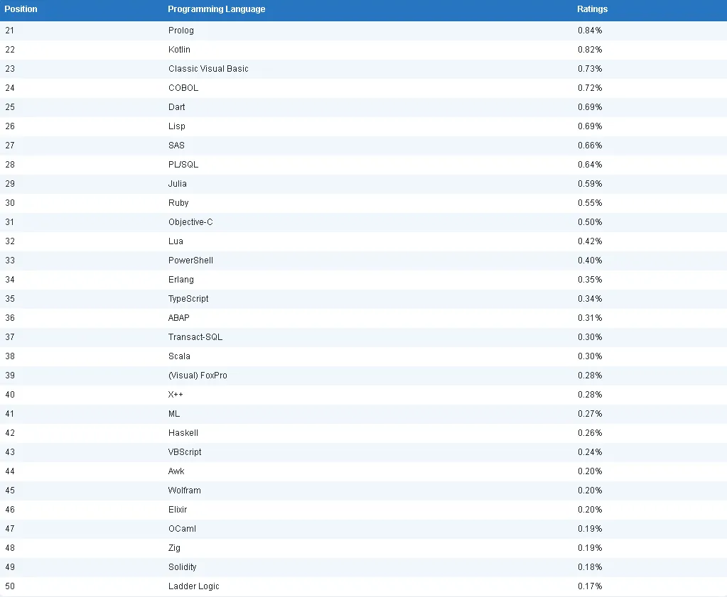 下面列出了完整的前 50 名编程语言。该概览为非官方发布,可能存在遗漏的语言。