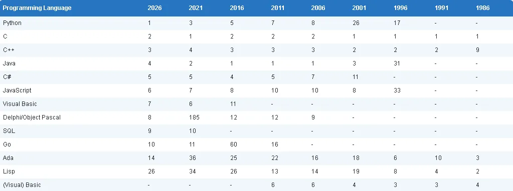 为了解更宏观的情况,下方列出了多年前前十名编程语言的位置。请注意,这些是基于 12 个月期间的平均排名。