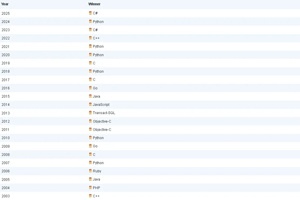 下方列出了所有“年度编程语言”奖的获奖者。该奖项授予在一年内评分涨幅最大的编程语言。