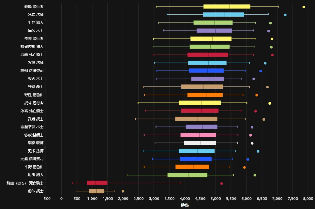 如果按国服“最强职业80%”的及格线来算,敏锐贼的80%是5129,那么射击猎5166、鸟德5229都踩线及格,只有血DK被甩出几条街。这么看,大部分职业其实不算太惨。