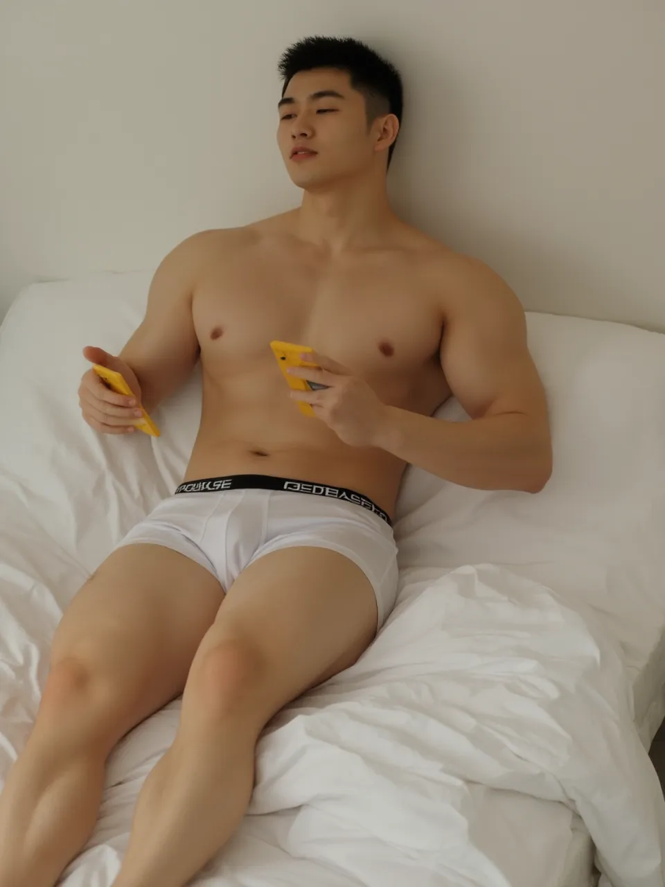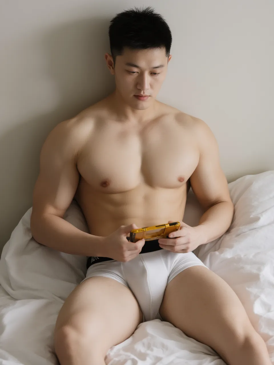 肌肉男卧床玩手机游戏