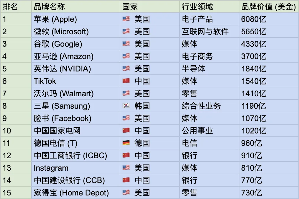 苹果为全球最有价值品牌;微软位居第二;谷歌第三,英伟达上升迅速,成为全球第5大品牌