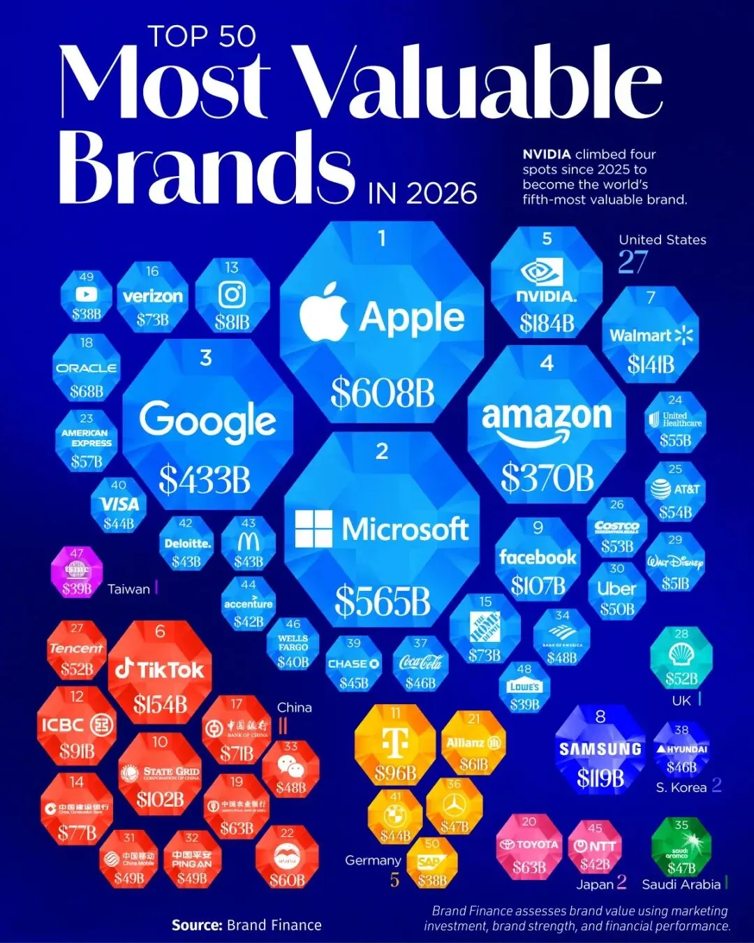 数据来自Brand Finance,评估标准包括:营销投入、品牌强度、企业整体财务表现。