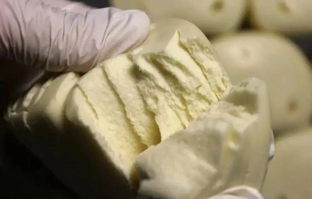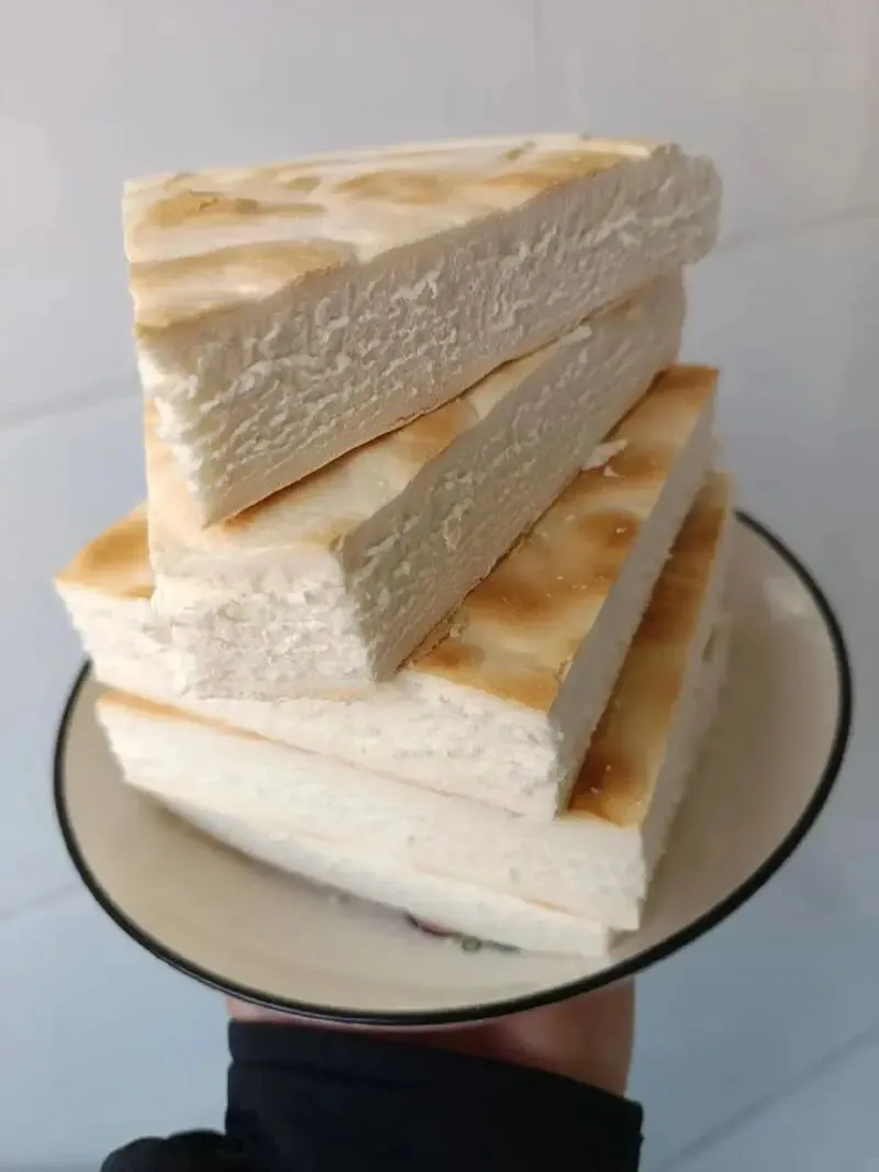 成品外硬内软,切开层次分明,开水一泡,瞬间暄腾得像蛋糕,压成糊状就是奶香的代餐,配上西瓜酱豆,那是真得劲!