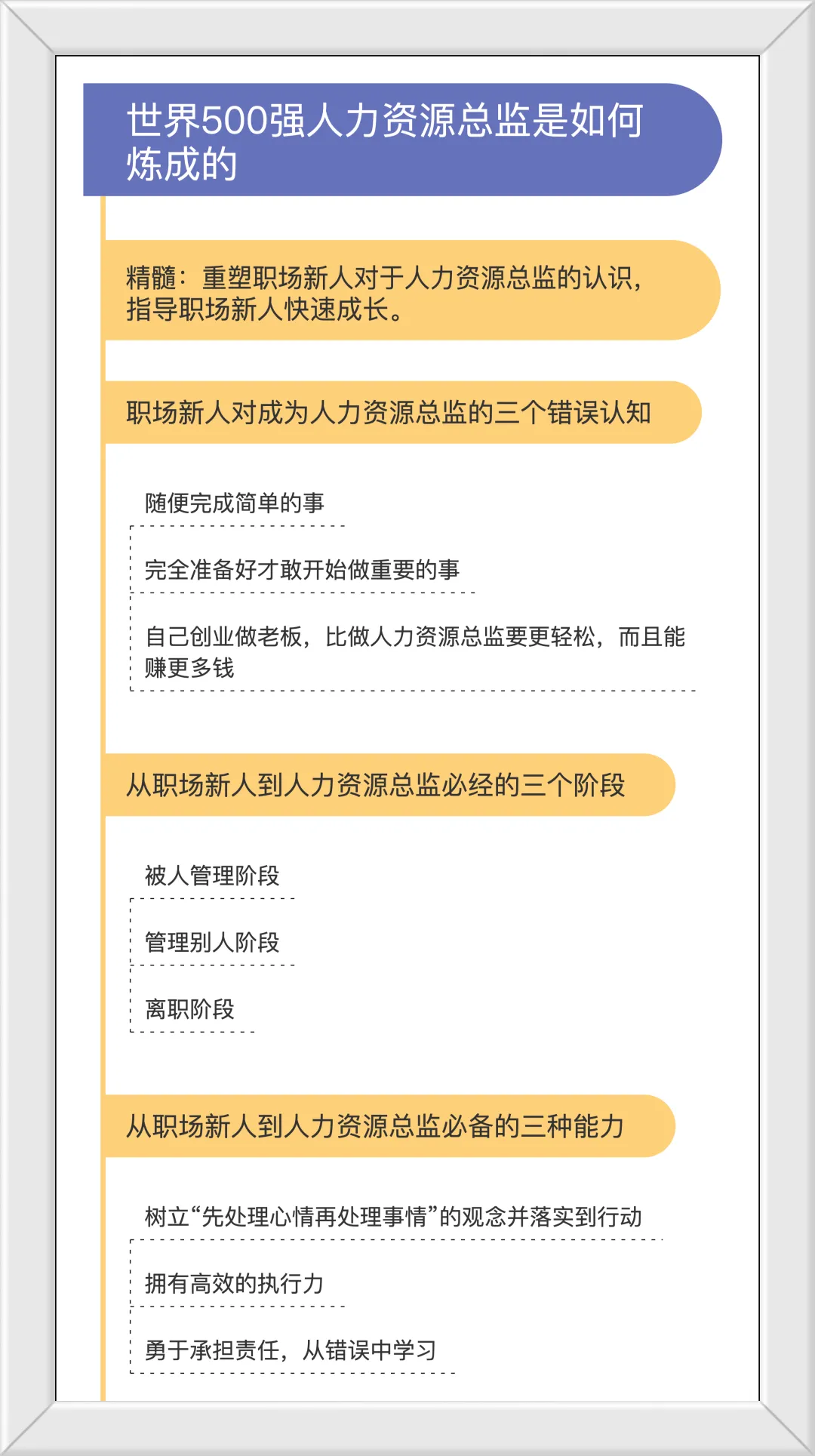 《世界500强人力资源总监是如何炼成的》是一本关于提升职场技能的指南,主要讲述了一位职场新人,如何在上司的引导、培训下成为一名高管。它通过真实的事例来讲述如何处理职场中发生的问题,以及我们应该具备和掌握的观念、心态、方法及技巧。作者简介李江华,知名HR实战专家,资深HR经理人,传课、多贝、中国网络电视台等网络培训平台著名讲师,中人网等知名人力网站专栏作家。现任某跨国公司CHO,另兼任东莞前劳务派遣有限公司、好伯乐世家管理顾问有限公司等十多家企业经营管理顾问。《世界500强人力资源总监是如何炼成的》。我会用10分钟左右的时间,为你讲述书中的精髓:重塑职场新人对于人力资源总监的认识,指导职场新人快速成长。每一个从人力管理专业毕业、第一次工作的职场新人,目标都是希望能坐到人力资源总监的位置。但职场新人在成长为人力资源总监的过程中,总会有各种疑问。比如职场新人如何快速、有效地提高自己的专业技能水平?如何和同事、上司相处?如何拥有管理思维,离晋升更近一步?面对这些层出不穷的问题,很多职场新人并不知道该怎么做,他们有的会自己摸索着处理;有的会听从过来人的建议;有的甚至会草率放弃成长的机会。那么我们该如何解决这些令人头痛的问题呢?这些问题在今天我们分享的这本《世界500强人力资源总监是如何炼成的》一书中,都能找到答案。本书作者李江华,是中国著名人力资源咨询专业专家,辅导过包括世界五百强人力资源总监在内的近千名HR专业人士。他以人力资源专家的视角,为大家剖析职场新人在成为人力资源总监的路上可能会遇到的问题,为职场新人提供了可行的方法,帮助职场新人快速成长。好,接下来我们来说这本书的核心内容吧。我将从三部分为大家讲解,第一部分是职场新人对成为人力资源总监的三种错误认知;第二部分是从职场新人到人力资源总监必经的三个阶段;第三部分是从职场新人到人力资源总监的三种必备能力。首先,我们来看第一部分:职场新人对成为人力资源总监的三种错误认知。在职场新人逐步成长为人力资源总监的过程中,需要付出诸多努力,只有当职场新人选择了正确的方向,使用了合适的方法后,才能做到事半功倍。因此,想要从职场新人成为人力资源总监,就要改变关于人力资源总监的三种错误认知。随便完成简单的事。公司安排职场新人完成简单的事,很多时候看重的并不是结果,而是看重职场新人的交际能力、适应公司环境的能力,以及是否有足够的耐心完成这种简单的工作。比如职场新人在公司培训期间,一般需要做一线员工所做的简单工作。职场新人如果随便对待,就很难了解基层员工和公司产品的情况,甚至可能连实习期也通过不了。第二、完全准备好了才敢开始做重要的事情。完全准备好的状态很少有,更多时候,我们是在完成这件事的过程中,不断提高自己的能力,让自己达到越来越轻松的状态。比如你是职场新人,公司看好你,决定把你调到另一个分公司做管理工作,这时你就应该勇于接受挑战,把握好这个锻炼自己的机会。第三、自己创业做老板,比做人力资源总监要更轻松,而且能赚更多钱。自己创业做老板,最终成功的只是少数人,虽然他们确实能赚到更多的钱,但同时他们考虑的问题也更多。比如资金是否足够周转?产品质量和创新如何才能比同类产品更胜一筹?要承受哪些风险等,因此在光环之下,其实老板比人力资源总监更累。接着,我们来看第二部分:从职场新人到人力资源总监的三个必经阶段。从职场新人到人力资源总监,是一个不断解决问题并逐步成长的过程。在这个过程中,职场新人有三个必经阶段,每个阶段都需要遵循做事先做人的原则。被人管理的阶段。处于这个阶段的职场新人,求知欲和学习能力都很强,但欠缺工作经验。职场新人要谦虚踏实,把目光放长远一点,不要对暂时的低薪酬耿耿于怀,更应关注如何积累更多的工作经验?如何拥有更多管理别人的机会?等你羽翼丰满的时候,高薪也随之而来。管理别人的阶段。当你的工作能力得到公司肯定,职位也会跟着上升。在这个阶段,作为职场新人的你切忌骄傲自大,应抓住机会锻炼自己的管理能力。比如你管理下属时,要以身作则,做好报表,要从有益公司和员工利益的方面入手,摸索总结出一套行之有效的选人办法等。离职阶段。虽然在离职阶段,你的工资福利等不再受公司制约,但你一样要认真做好交接工作,不要给公司业务增加不必要的麻烦,更不要借此机会,报复平时和自己有过节的同事。毕竟很多同事都在同一个圈子,这种行为相当于自我抹黑。最后,我们来看第三部分:从职场新人到人力资源总监的三种必备能力。职场新人要成为人力资源总监,还需要三种能力,接下来让我们一起来看看。树立“先处理心情,再处理事情”的观念并落实到行动。职场新人想要成为人力资源总监,更多是要处理各种琐碎的事。比如你要和下属一起出差完成公司招聘任务,下属安排行程时没考虑到天气等其他特殊情况,导致要多在酒店待一天,这让你十分不满。但是这时你不能马上发泄你的负面情绪,而应给足时间 让双方冷静下来,再想解决的办法。有高效的执行力。执行力会影响到你的行动能否达到预期的目标。比如上级要开一个重要的会议,让你去通知各大部门的人按时