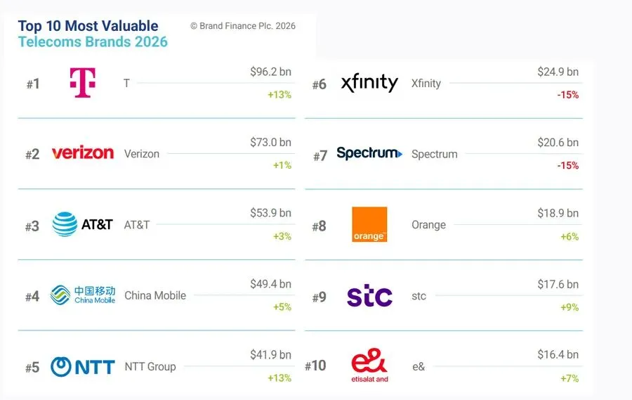 英国品牌评估机构“品牌金融”(Brand Finance)发布2026“全球电信品牌价值150强”排行榜(Telecoms 150 2026),德国电信、威瑞森、AT&T、中国移动蝉联前四位。