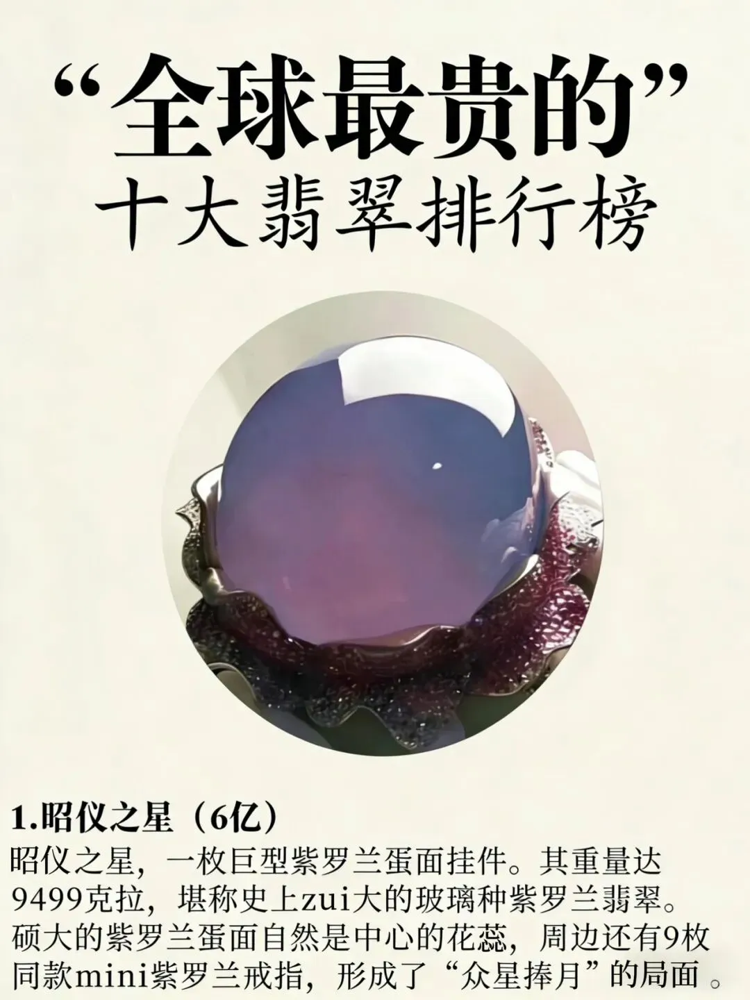 🔝1️⃣昭仪之星:9499克拉玻璃种紫罗兰蛋面,体量与品质罕见,配套设计完整。