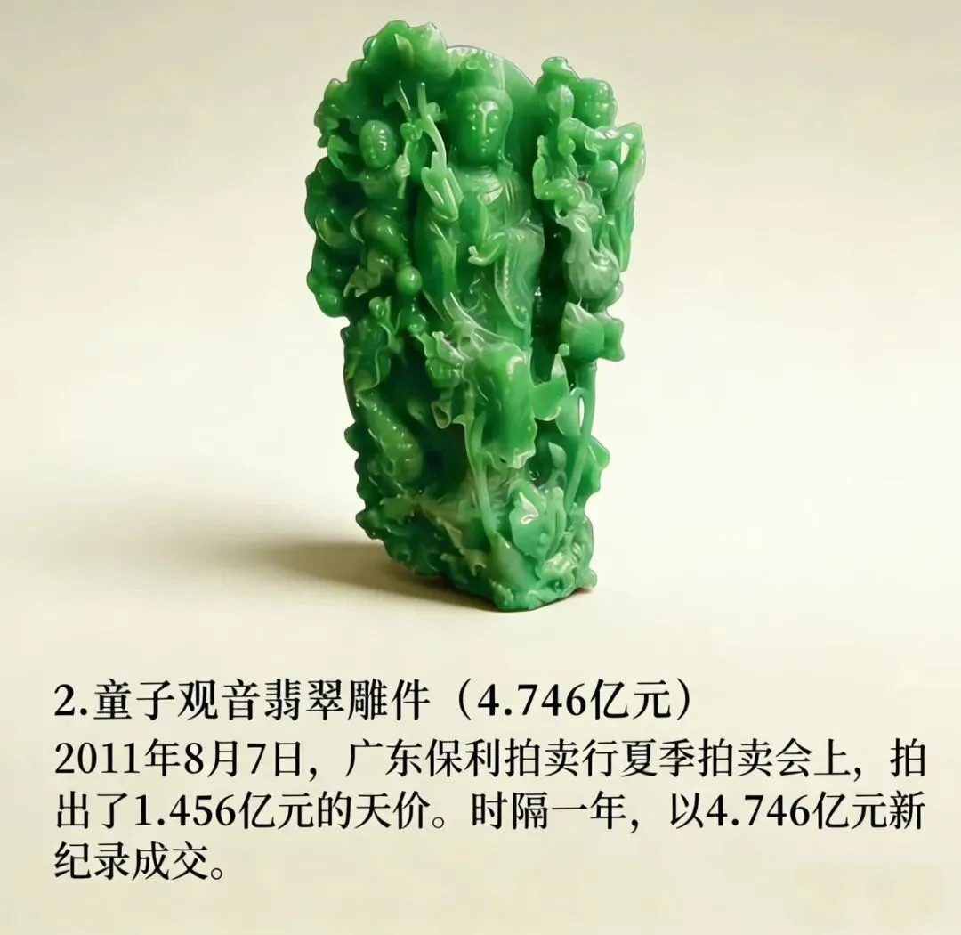 🔝2️⃣童子观音翡翠雕件:两次拍卖均创下高价,工艺与材质双优,是大件翡翠的代表。