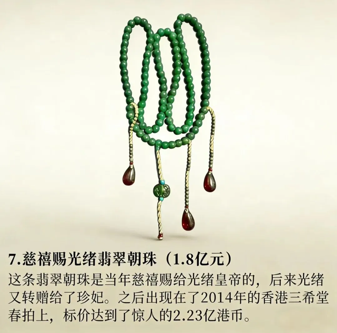 🔝7️⃣慈禧御赐翡翠朝珠:制式完整、传承有序,因文化寓意特殊,市场流通并不多见。
