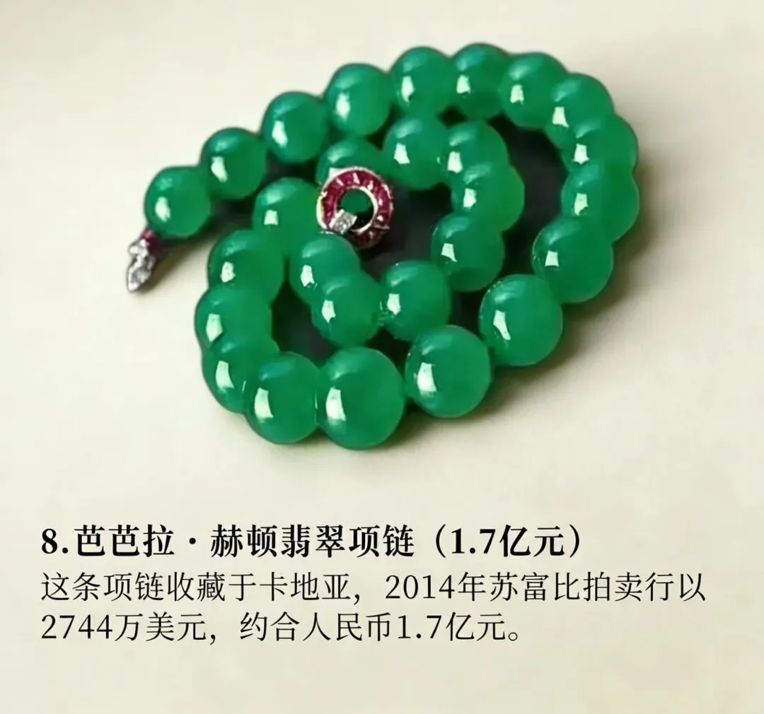 🔝8️⃣芭芭拉·赫顿翡翠珠链:27颗老坑玻璃种圆珠搭配卡.地亚镶嵌,兼具材质与历史价值。