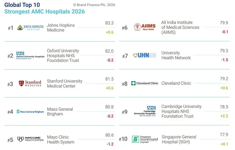 英国品牌评估咨询公司“品牌金融”(Brand Finance)发布“2026年全球医院250强”榜单(Global Top 250 Hospitals 2026)。在最有信誉的医疗中心(Academic Medical Centres)100强中,美国约翰斯·霍普金斯医院、英国牛津大学医院NHS基金会信托基金和斯坦福大学医学中心排名前三位。