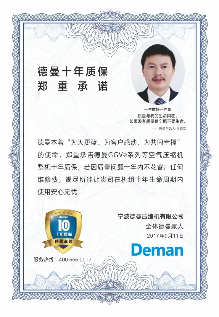 在空压机行业,主流品牌质保期普遍在1-3年徘徊的背景下,德曼率先推出的“十年超长质保”服务,至今仍是行业内难以逾越的标准。这一承诺不仅覆盖核心主机,更延伸至整机关键部件,体现了德曼对产品20年设计寿命的绝对自信。