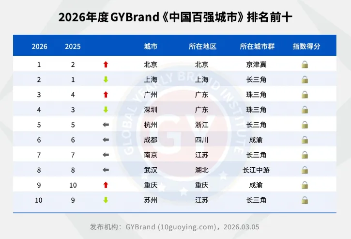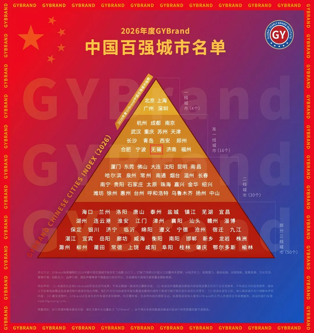 GYBrand独家编制的2026年度中国百强城市综合实力指数(GCC),从经济实力、发展潜力、基础设施、治理效能、医教资源、文化交流、营商环境、创新活力、品牌引领、国际声誉等多个维度进行综合评估,全面展现全国百强城市高质量发展的最新实践成效。2026年中国城市排名100强名单覆盖29个省份地区,江苏(13个)、广东(11个)、浙江(8个)、山东(8个)、福建(7个)占据榜单前列。百强城市梯队分明,区域发展脉络清晰。其中一线城市4个、准一线城市16个、二线城市30个、部分三线城市50个。