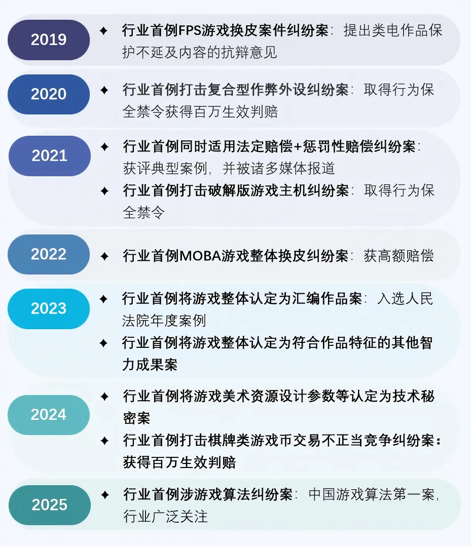 深耕行业:聚焦游戏行业十余年,熟悉研发、发行、运营全链条法律需求,精准应对行业特有挑战。