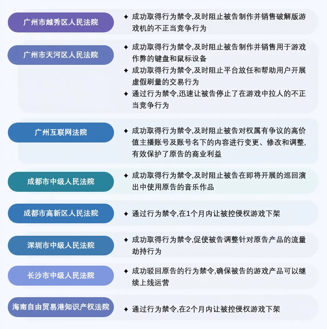 经验丰富:服务上百家游戏客户,成功处理数百起诉讼与合规项目,代理多起行业标杆案件,以创新策略维护客户权益。
