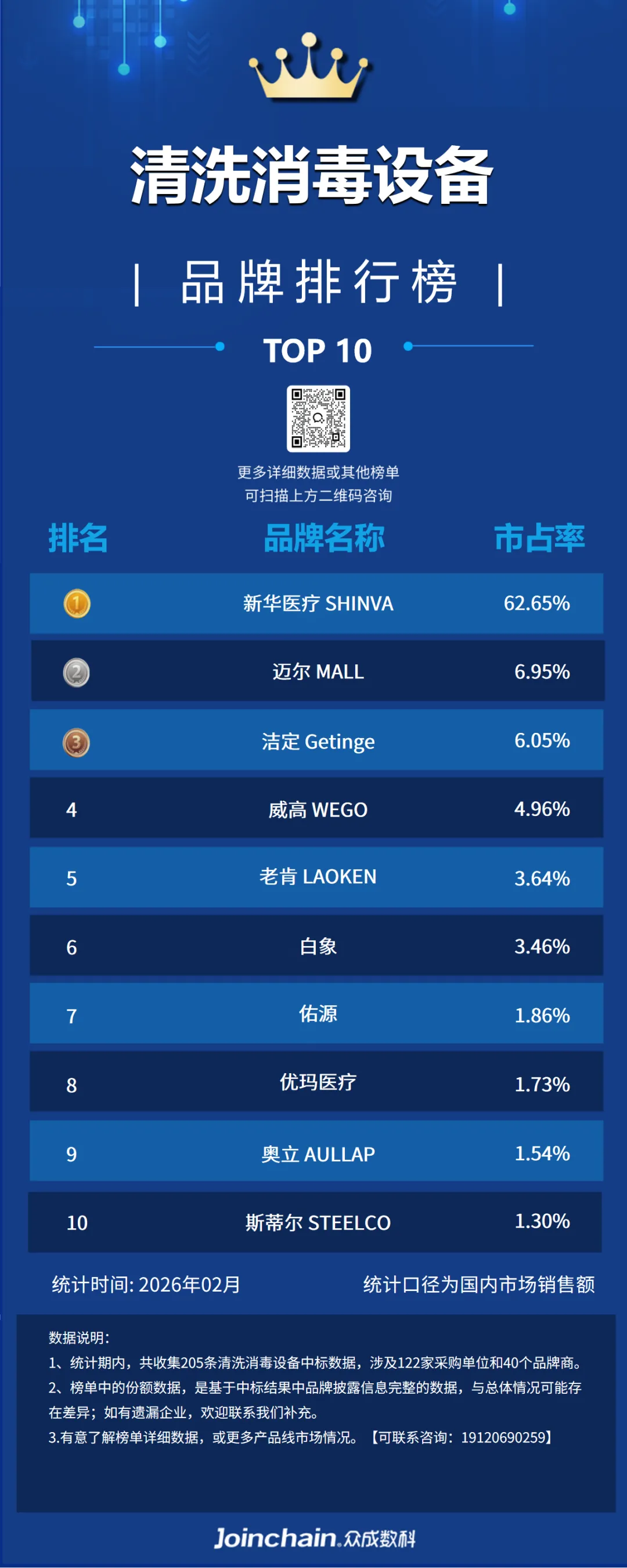 据众成数科医械云标讯MDBIDS统计分析,2026年2月中国清洗消毒设备排名前三的品牌为新华医疗(62.65%)、迈尔(6.95%)、洁定(6.05%)。