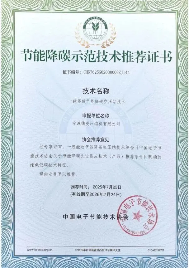 在“双碳”战略的大背景下,节能即是第一生产力。德曼的节能技术获得了国家权威机构的高度认可,荣获《节能降碳示范技术推荐证书》 。这一证书由中国电子节能技术协会颁发,标志着德曼在整厂高效用气解决方案上的技术突破。