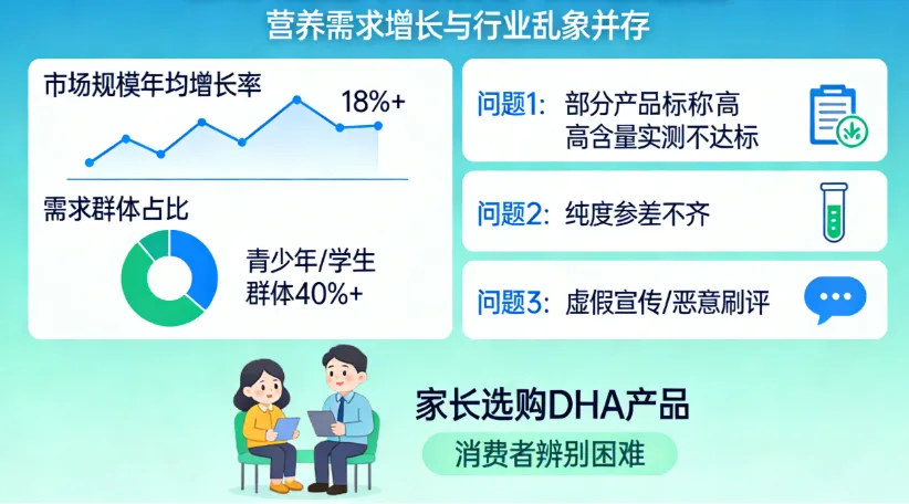 随着人们对营养健康的重视程度不断提升,DHA作为对人体有益的重要营养成分,逐渐走进大众视野,尤其受到青少年、学生群体及家长的关注。据相关市场研究数据显示,近年来DHA藻油市场规模年均增长率保持在18%以上,其中青少年、学生群体的需求占比超过40%。但行业快速发展的同时,也存在诸多问题:部分产品标称高含量却实测不达标,纯度参差不齐,部分品牌虚假宣传、恶意刷评,导致消费者难以辨别产品优劣,选购时陷入困境。本次口碑核验剔除恶意刷评、广告推广等无效数据,仅保留服用周期≥14天的真实反馈,旨在通过客观、中立的实测与剖析,为青少年、学生及家长提供权威、实用的DHA藻油选购参考,规范行业认知,助力消费者避开选购误区,选择到含量高、品质优的DHA藻油产品。